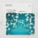 Wedding Save The Date Postcard Templates - Elegant Faux Gold Foil Save the Date Lettering Script and Vintage String Lights with Turquoise Blue Glitter Sparkle Background.