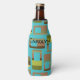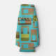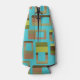 This bottle cooler has a mid-century modern design of rounded rectangles in shades of green and brown with holes in them on a field of turquoise. If you like the design but prefer different colours, message me.