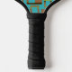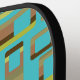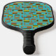 This pickleball paddle has a mid-century modern design of rounded rectangles in shades of green and brown with holes in them on a field of turquoise. If you like the design but prefer different colours, message me.