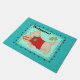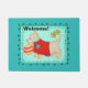 Show your dog love with this scottie welcome door mat for your home or work. The word "welcome" can be changed to personalise with a name. This rug features a whimsical beige champagne coloured Scottie Terrier that is wearing an red tee shirt with turquoise teal trim. A yellow and red ball is beside him or her. The background is turquoise teal blue stripe with a teal border with black paw prints. A serpentine line border is inside the teal border. Two yellow flowers are above the dog. This cute, cuddly and trendy dog is original art by Phyllis Dobbs and will melt the heart of a dog lover. This Scottie dog door mat is fully customisable to make it your own!