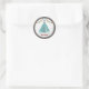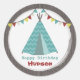 A camping themed birthday sticker featuring an illustration of a turquoise tipi and bunting. Background is wood inspired. Personalise the text. Look for matching invitations at Jill's Paperie.
