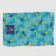 Monogrammed golf towel with a tropical floral pattern in turquoise with yellow and pale blue flowers, and dark blue leaves. Add your initial and name for a personal touch!