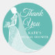 Turquoise white elegant lace gown bridal shower, thank you classic round sticker featuring a bride wearing an elegant lace wedding gown on a turquoise background with a beautiful script white text for your special bridal shower details. You can customise the background colour to coordinate with your wedding theme.