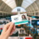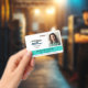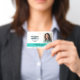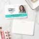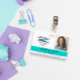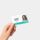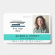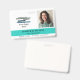 Horizontal employee ID badge personalised with photo and logo, name and title, and badge number and expiration date. Add name and title in black on turquoise.