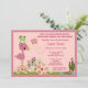 Featuring a mummy turtle lovingly kissing her newborn baby turtle on the head. Other cute animals are stacked on on the baby, including an adorable flamingo, and a frog (froggy/froggie). There's also a cute butterfly and a chick (bird/birdie/chickie). In different shades of tropical pink and orange/peach. Pretty florals include a hibiscus-patterned turtle shells. This MonkeyHutDesigns baby shower invitation perfectly coordinates with the Once Upon a Pond baby crib bedding set and can match any girl pond (ducks, frogs, turtles) theme nursery.