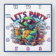 A vibrant turtle in sunglasses enjoys a beer while riding a skateboard, surrounded by colourful swirls and flowers, inviting everyone to join the fun!