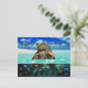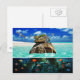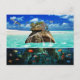 Ocean floor cutaway of turtle with encampment (secluded resort) on the top including wooded hut, rocks, multiple types of trees even a driftwood & carved rock stairway leading up to the wooden hut, with a goddess like women, in a long red scarf, which is blowing in the wind, holding her arms & above her head, standing at the top. The turtle is emerging from the water & there is water rushing off of the shell, around the rocks and under the fortress built up above the shell. Around & under the turtle is a wide variety of sea life including fish, starfish, sponges and a wide variety of seaweed. The crystal clear water wraps around a bright white sand peninsula, with matching clouds over a blue sky, three seagulls complete this modern tropical ocean fantasy retreat art.