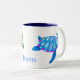 Colourful mug, with the graphics of painted turtles in blue and green. Customise the text to personalise this cute coffee / cocoa mug.