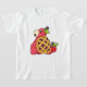 100% cotton so perfect for summer, It is a nicely designed t-shirt, the fabric is soft and the seams finished well, the body of the t shirt has no side seams. I bought a medium size for my two grandsons, aged 9 and 8 it will be slightly big on them but I would rather that than too small