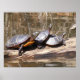 A photograph of a family of turtles sitting on a log and sunbathing.