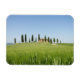 Rectangular souvenir photo magnet with a farmhouse with cypress trees and waving wheat grains in spring in the Val d’Orcia valley in Tuscany, Italy.