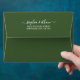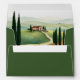 Green watercolor Tuscan landscape with a villa and cypress Tuscany Italian destination wedding envelope. Imagine a stunning green watercolor depiction of a Tuscan landscape, featuring a charming villa and elegant cypress trees, perfect for your destination wedding invitations. The inside of this beautiful envelope design encapsulates the allure of Tuscany, highlighting its iconic rolling hills blanketed in lush fields and the serene beauty of the countryside. A winding road leads to a quaint stone villa adorned with terracotta roof tiles, nestled harmoniously among the fields. This artwork captures the romantic spirit of Tuscany, reflecting the tranquillity, rustic charm, and natural splendour that make this region so enchanting. The outside is of green colour. Keep in mind that this is an artistic interpretation, not an exact representation of Tuscany.