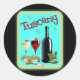 A bottle of wine and 2 glasses is the centerpiece of this design. Green grapes accent the background along with text that reads: "Tuscany". This design is sure to appeal to vintage travel poster fans.