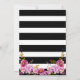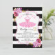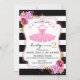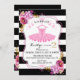 Tutu ballerina inspired birthday invitation card design with watercolor floral bouquets and gold glitter-look sprinkles over a bold black and white stripe background.
