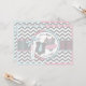 A gender reveal party invitation featuring an adorable polka dot jumper with blue tie and pink tutu and a grey and white chevron print with 3D-look bows and trims.