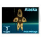 This postage stamp for an independent Alaska features a brown-toned fractal image suggesting a highly-stylised Inuit hunter, wearing traditional fur clothing and holding a harpoon with an ivory head. The hunter is superimposed on a background depicting the dark polar winter - a bluish snow surface, dark starry sky with the green glow of the Northern Lights on the horizon. Text reading "Alaska, " "Arctic Heritage," and "Postage 3 Nuggets" appear in glowing blue and white. "Tuvaaq" is the word for hunter in Inuktitut, the Inuit language.