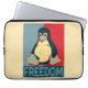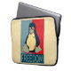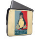 A design in the style of the famous Obama hope poster showing Tux, the official Linux mascot with the slogan Freedom, because Linux is both free as in beer and in speech. The Tux image was designed by Andrew McGown and recreated as an Inkscape SVG by Josh Bush, and is released under Creative Commons license CC-BY-SA, see http://git.kernel.org/cgit/linux/kernel/git/torvalds/linux.git/tree/Documentation/logo.txt?id=8032b526d1a3bd91ad633dd3a3b5fdbc47ad54f1