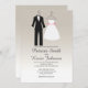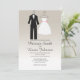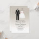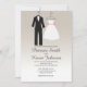 A simple and trendy wedding invitation with a neutral coloured gradient background, featuring a tuxedo and a wedding dress.