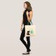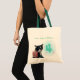 Painting of the number four in green with pink swirl ribbons, with a photo of our tuxedo cat wearing a pink and white striped dressed, with a placeholder for your words, is printed on custom canvas bags.