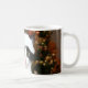 Black and white tuxedo cat wears a Santa hat in front of a Christmas tree cat lovers holiday coffee cup or mug