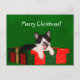 Young black and white tuxedo cat sits on a holiday gift and wishes everyone a Merry Christmas cat lovers Christmas postcard. Text can be easily changed