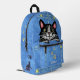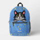 This fun novelty backpack includes a faux (printed) denim / blue jean look with a cartoon black-and-white tuxedo kitty cat that appears as if it's sitting inside the front pocket! The design also includes silhouettes of paw prints and a cat / bird silhouette on one side. Use the easy template to add your name or your cat's name to the design (or simply delete the sample name "Tabitha" to order without a name). These cute backpacks make the perfect gift for any cat owner! They would also be fun for an animal groomer or vet. Find more cat colours and also find this design on other products in the store here: https://www.zazzle.com/store/laborandleisure