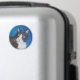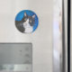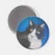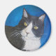 Portrait painting of a black and white tuxedo cat with yellow eyes. The cat faces the viewer looking slightly off to one side in a regal cat pose. The cat's pet portrait is accented against a royal blue background. Customise this cool cat art portrait magnet with your own personalised text and images to make special cat lover gifts!