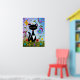 A black and white tuxedo cat sitting amongst the grass and flowers in a colourful garden. Surrounding her are flowers and leaves and colourful shapes. She has the prettiest green eyes and is wearing a red collar.