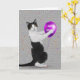 Black and white cat with purple balloon and confetti on polka dot background for general birthday.