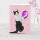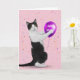 Black and white cat with purple balloon and confetti on polka dot background for general birthday.