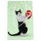 Black and white tuxedo cat holding a red party balloon with colourful confetti on a mint green background.