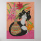 This curious young tuxedo cat is sitting on a beautiful pink tabletop with her fluffy tail curled around a beautiful country French-style vase of multicolored lilies. She just couldn't resist pulling out one bright orange flower! The entire scene takes place against a gentle peach-coloured background.