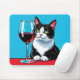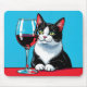 A black and white cat with bright green eyes sits beside a glass of red wine on a red table