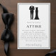 Celebrate to your love story with this minimalist wedding wedding attire card. Designed with an elegant wedding dress and tuxedo and old money black and white colour scheme, this card is the perfect stationary to add to your invitation suite for your special day. Add the bride and groom's wedding details for a personalised touch.