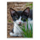 Black and white kitten hiding behind blades of grass for humourous birthday.