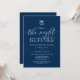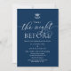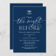 Modern Romantic Calligraphy, navy blue Scheme, mistletoe with wedding bells, Wedding Rehearsal Dinner invitation card (with card title: the night before). It is perfect for your wedding rehearsal dinner celebration party, before your best day. Add your details in matching black font / lettering.