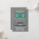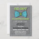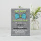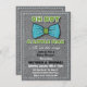 Super cute fabric inspired, tweed little man baby shower invitations with blue tweed bow tie and fun typography with green tweed fonts. Grey tweed background with stitching. Hand drawn illustration by McBooboo.