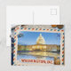 This postcard captures the United States Capitol glowing against a soft evening sky, its reflection shimmering across the wet pavement below. Surrounded by travel‑themed accents—maps, stamps, and the promise of adventure—the scene evokes the excitement of exploring one of America’s most iconic destinations. A timeless keepsake for travelers, history lovers, and anyone inspired by the grandeur of Washington, D.C.