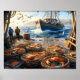 1. This stunning painting captures a picturesque scene of crabs being sorted on a boat by a group of fishermen as the sun sets, creating a warm and inviting glow over the ocean.