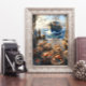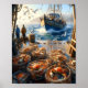 1. This stunning painting captures a picturesque scene of crabs being sorted on a boat by a group of fishermen as the sun sets, creating a warm and inviting glow over the ocean.