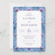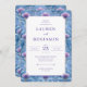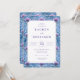 This is a vintage style image featuring an elegant wedding invitation adorned with intricate blue and purple floral patterns. The central white panel showcases the names "Lauren and Benjamin" in sophisticated typography, surrounded by lush botanical designs that evoke a sense of timeless romance. Perfect for setting the tone for a classic and enchanting celebration, this invitation promises a day filled with beauty and joy.