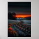 This evocative wall art poster captures a moody and atmospheric landscape centered on a winding set of train tracks leading into a fog-shrouded distance.
