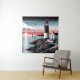 The tapestry depicts a striking lighthouse standing as a twilight sentinel over tranquil ocean waters. As the sun sets, it casts a radiant backdrop of red and pink hues across the sky, mirrored by the sea's glassy surface. The graphic illustration style lends a crisp and clean look, with the lighthouse's iconic stripes providing a visual anchor in the composition. Seabirds in flight add a sense of freedom and grace to the scene, while the coastal home nestled beside the lighthouse offers a glimpse of life at the shore. This artwork is a harmonious blend of nautical charm and graphic precision, ideal for those drawn to the romance of maritime settings and the calm of dusk by the sea.
