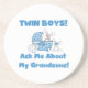 Proud new grandmas of twin baby boys will love this cute blue design featuring two bunnies in a blue bassinet and blue text that reads "Ask Me About My Grandsons!"
