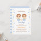 Cute cartoon baby boys in matching blue rompers and yellow bibs holding baby rattles. Lovely and original baby shower invitation.