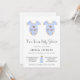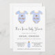 Celebrate the mother-to-be of twin boys with this fun baby shower invitation featuring retro inspired pastel blue and gold watercolors of baby one piece snapsuit outfits. "It's a Twins Baby Shower" is written underneath in a contemporary script. A small pastel blue and gold watercolor of a baby bottle at the bottom of the invitation separates the party location and RSVP details.