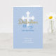 When twin boys will have their dedication ceremony, this blue card will be perfect to send! A centre cross is highlighted by rays and the message for the twin boys on their dedication day is highlighted with blue and a gold look. (digitally rendered, not read gold foil)