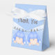 Cute twin baby boys with blue PJs hanging on a clothesline for thank-you baby shower favours