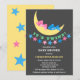 © 2013 Socialite Designs. Cute pink and blue teddy bears sleeping on the moon twin baby shower invitation. The design also has a star banner and "It's Twins!" text. The back of the invitation has a yellow background with assorted sized pink and blue stars. All design elements can be moved, resized or deleted to suit your event.
