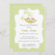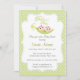 Baby shower invitation with peas in a pod design for twin girls. The background is lovely green polkadot.